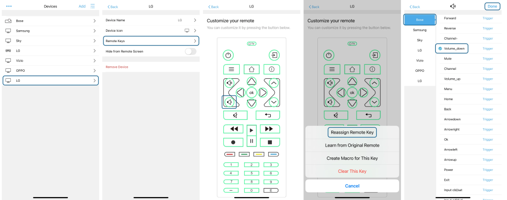 Select your TV device –>> Choose “Remote Keys” –>> Tap the Volume button –>> Select “Reassign Remote Key” –>> Switch to your speaker device –>> Find and select the volume command –>> Click “Done” in the upper-right corner