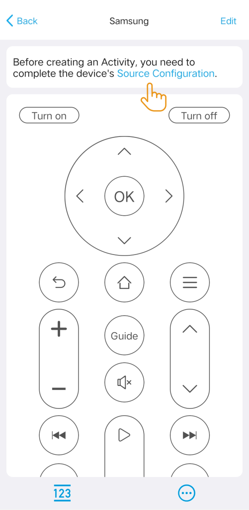 For some devices like TVs, projectors, AV receivers, you will see a message at the top of the page, reminding you to complete a settings task before creating an Activity. To access the settings page, click on “Source Configuration” (or “Manage Input Sources”).