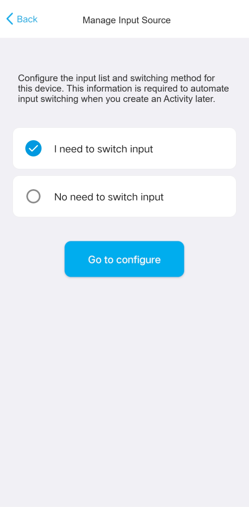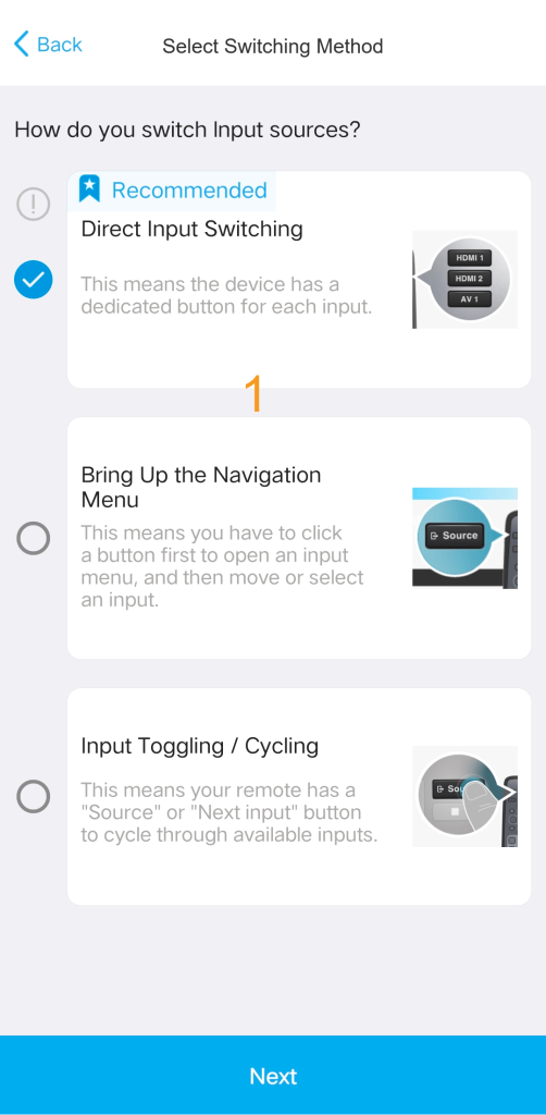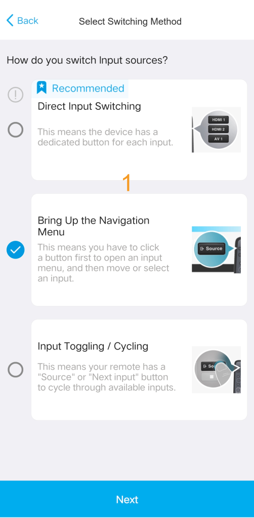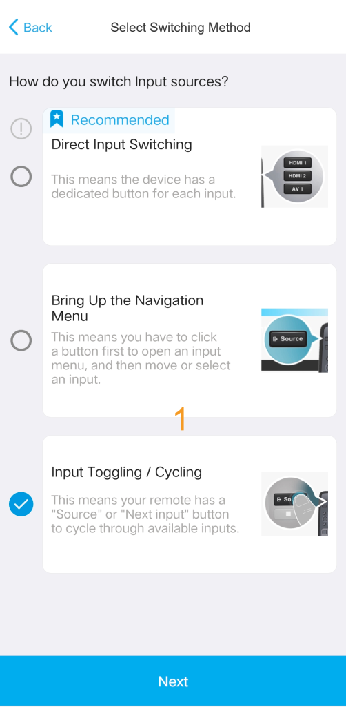 When you begin configuring your source, the system will prompt you to select the method your device uses to switch between inputs.