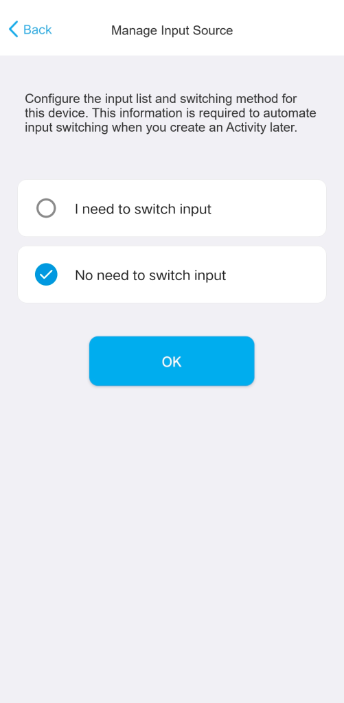 • TV Setup: For the TV setup, select “No need to switch input” and click “OK” to exit. This action will cause the Source Configuration tab on the Device Control page to disappear.